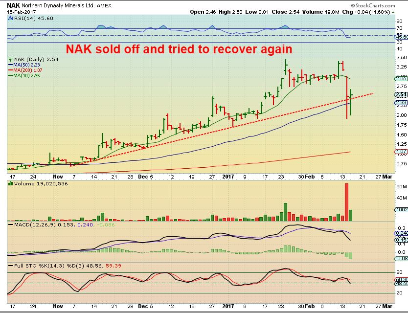 NAK – Think about it, those sell offs in AAPL, AMD, FNSR, etc. etc. in their bull runs were scary too. I mentioned in yesterdays report that people would come home Tuesday and see what happened, and NAK would have a 2nd phase of selling Wed morning. I thought that then shorts may cover, buyers may step in , and it could recover. THAT BEING SAID – I’d watch NAK to sell down Wed morning and then use the 50sma as a mental stop after that. Now the loose selling may be done. NAK is supposed to have a rebuttal to the article written by the Fund Shorting it. It has recovered 2 times. Now I do not expect a lot of selling from here without further bad news.