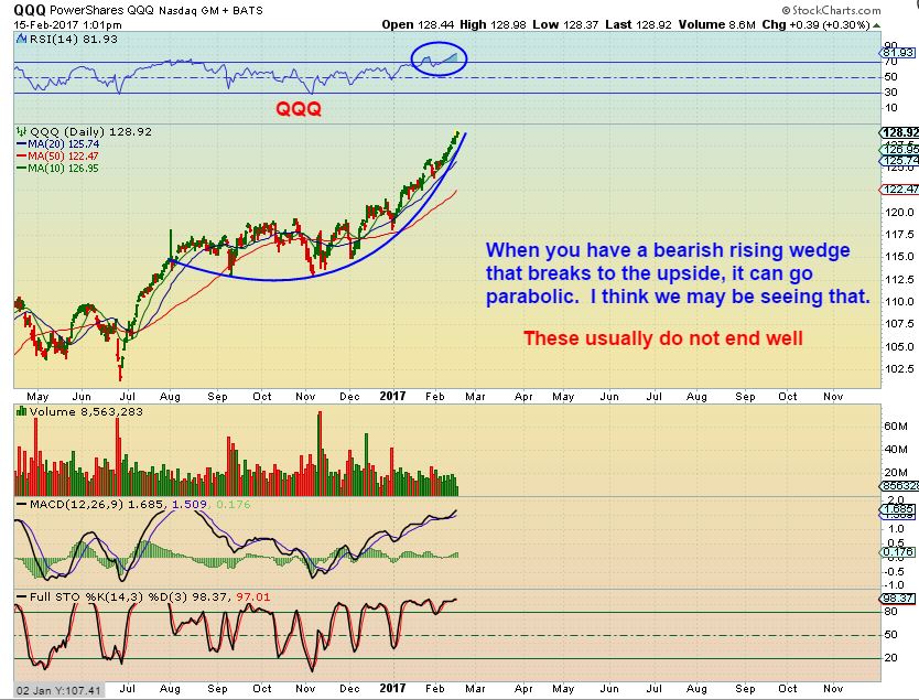 QQQ – The NASDAQ is red hot and could be going parabolic. If you have seen a parabolic rise in the past, they usually run red hot and everyone gets Very Bullish, then they end rather ugly. This is when people will start feeling like they are missing the boat. Emotions take over. Buyers want to just jump in “because I read that the markets are going a lot higher!” This is just a big picture look to keep everyone aware that the trend is the friend ( until it changes). Like NAK, a sudden news event or situation can bring this down quickly when time runs out. For now, It will likely continue to melt upward, so if you are long, stay long and use trailing stops. In a market melt up, this run can keep going.