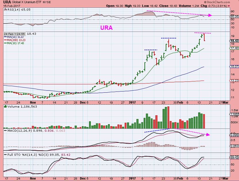 URA – Higher highs with divergence usually lead to a dip. How far? Is the climb done? It is hard to tell. The last peak in January looked like a top, but it wasn’t. Is this, or will it just keep stair stepping higher? …