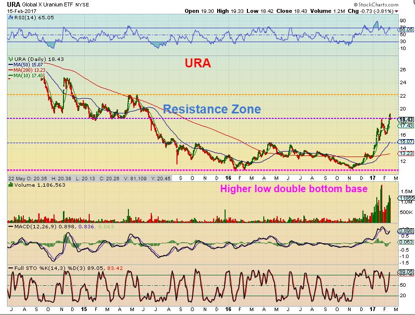 URA LONGER TERM – I believe Uranium has sprung up from a double bottom base with a higher low. It looks to have begun the next Bull market, and the Uranium stocks have been on fire. In time, I think Uranium will continue higher.