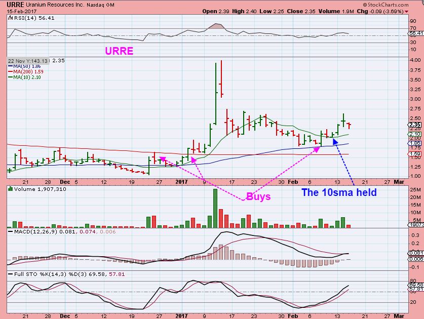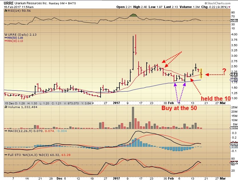 So I took a trade in URRE (Again) recently and posted it here. I’m pretty sure that his is the only Uranium that I recommended as a buy in February, though I really wanted UUUU too. We bought in December and sold that with 100% gains. The next buy was at the 50sma, and then it popped and landed on the 10sma.