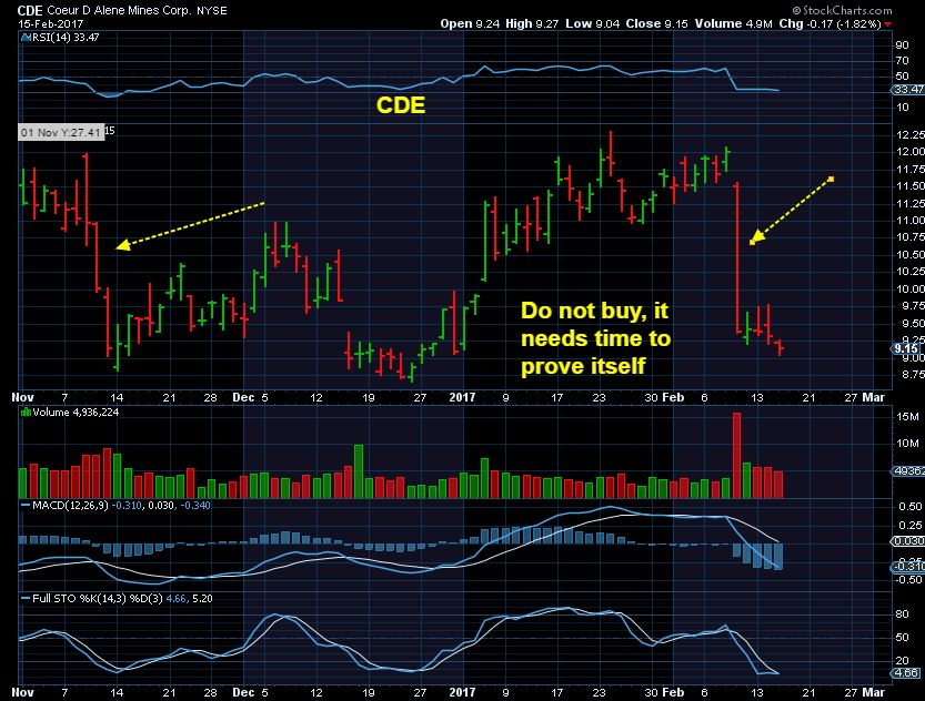 Now look at CDE. It has not recovered, it is struggling. NAK has recovered from both waves of loose selling. It may or may not hold here, but it looks better than CDE. CDE is a broken chart that needs time to earn buyers trust. Buyers seem to believe in NAks potential at this point. Time will answer all of the rest of our questions and opinions.