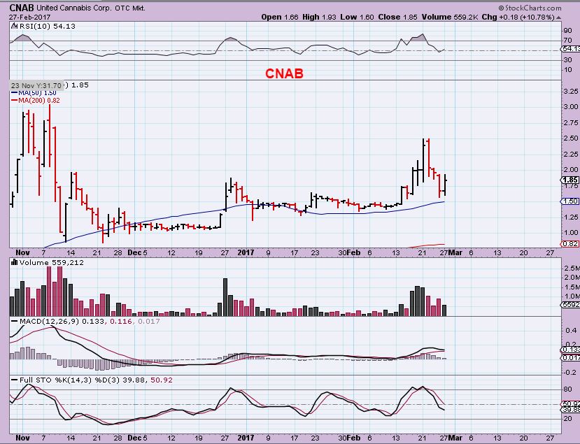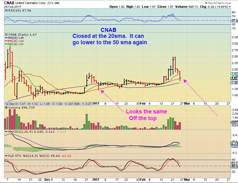 Also some of those Medical Marijuana stocks had a slam down and I thought that they may still be fine. I was pointing out in the weekend report that the CNAB slam down looked quite similar to the one in December. If so, that would end the selling.
