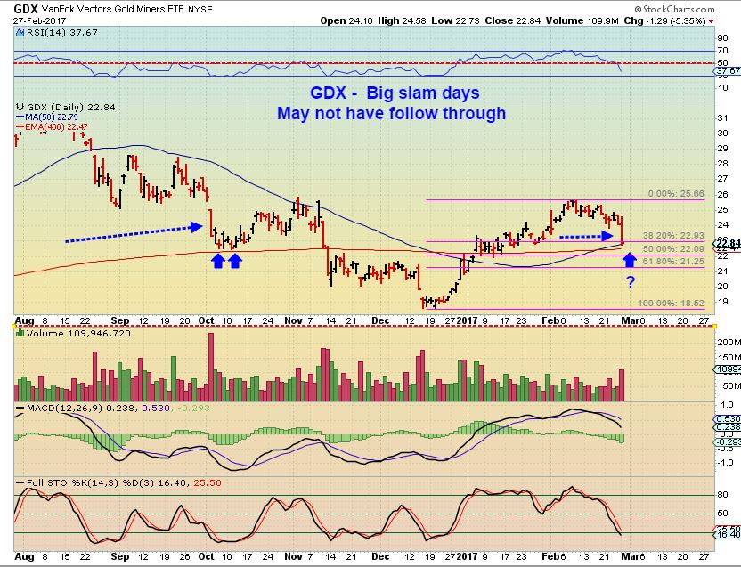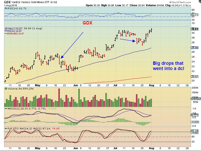 GDX in 2016 – I looked for 1 day slam downs in the 2016 Miners run up and yes, we did endure a few at that time too. It did not happen as EARLY in the run though, like we see now, but I wanted to see what happens in the days following a slam down.  Here we see that price still drifted a bit lower to a dcl, then took off higher.