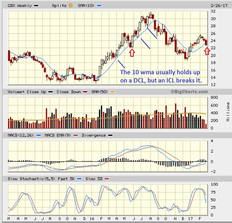 GDX WEEKLY –  I am seeing things in the weekly charts (This is only 1 of a few things)  that usually does not happen on normal pullbacks to a dcl, and definitely do not happen 2 months out of an ICL. This needs to repair itself very quickly in my opinion. It looks like the MAY 2016 ICL. This HAS happened in the past, but it can lead to those long consolidations that I have pointed out before.