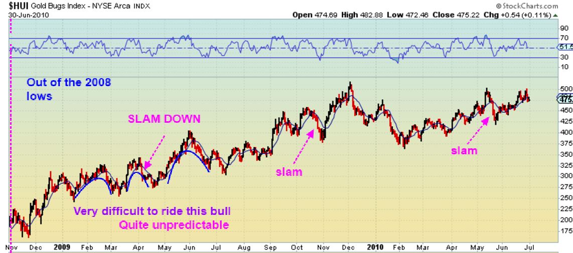 With that crazy ridein the above chart, please notice that HUI went from roughly 170 to 500 in 1 year.  HUGE gains, but day to day tough to ride.