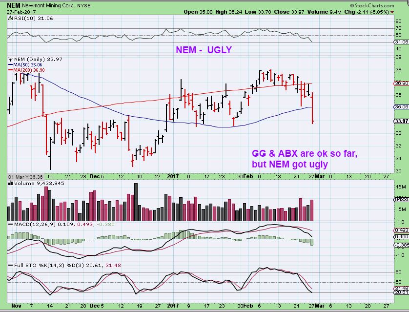 NEM – NEM  looked weaker and yet it tagging the 50 sma and bouncing along. This got ugly Monday. So far, NEM lost the 200 and 50 sma. Where is support? Is this a Shake out or break down? Now I would say that this is UGLY with Gold at 3 month highs.