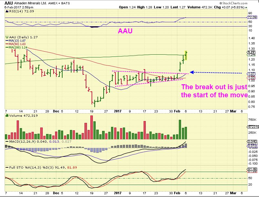 AAU– I wanted to show this Miner to make a separate point : The 1 day break out often is not the end of the move in a bullish sector, especially after a consolidation near a resistance point.