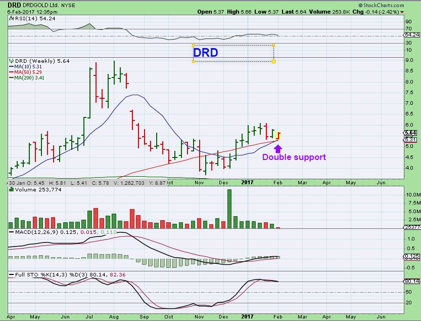 DRD – I saw this at noon and I could see that it gapped down 40 cents and was in the process of recovering. It was down 14 cents, but the weekly chart was a ‘buy’ the way I look at them. It almost landed on a double support area, and THAT was a great Buy area, falling on lightish volume. .