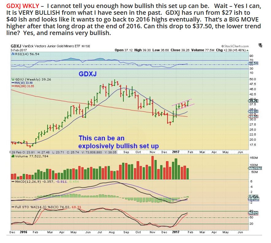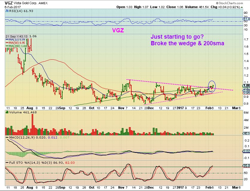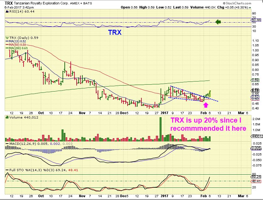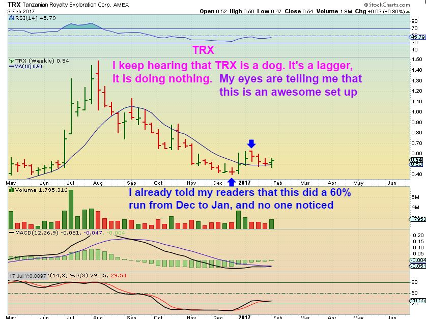 TRX – This chart is from the weekend report. I have been posting about TRX in almost every report for a week. I still have people telling me that this is not even responding to Golds move higher this time around, they say that it is dead, so let me review it again. TRX ran up 60% off of the DEC lows. I then recommended it again at the dcl.This weekly chart is bullish.