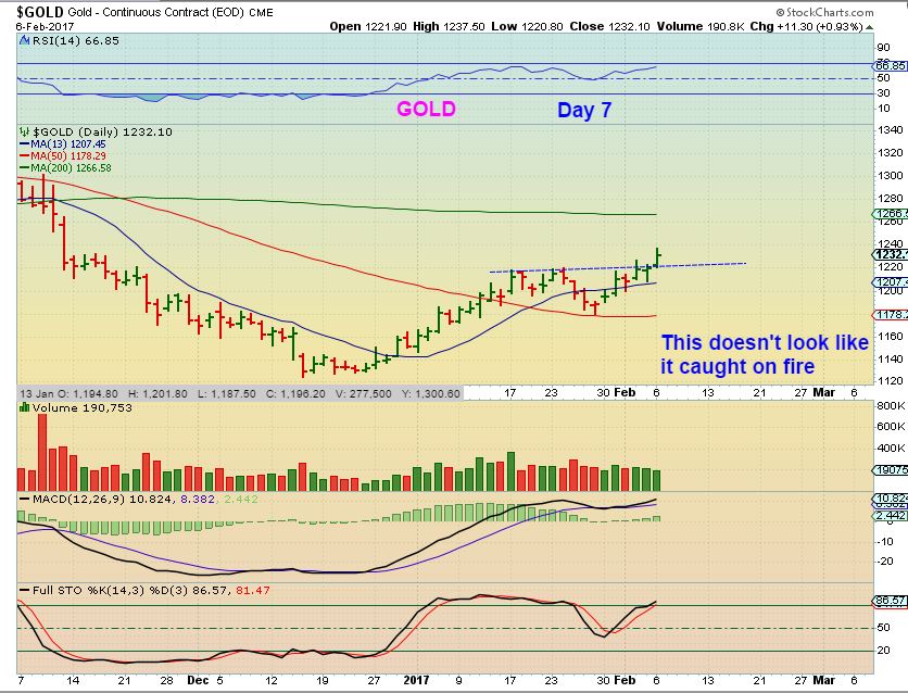 GOLD – I called this a DCL the day it tagged the 50sma, and I feel that this is day 7. I pointed out why I called it a dcl in last Wednesdays report. I started to point out many bullish set ups in Miners and many have been ‘re-added’ to our Dec low positions ( and many others have just held on for the ride). Doesn’t this look like it has more upside to it? I certainly believe that it does if this was only day 7.