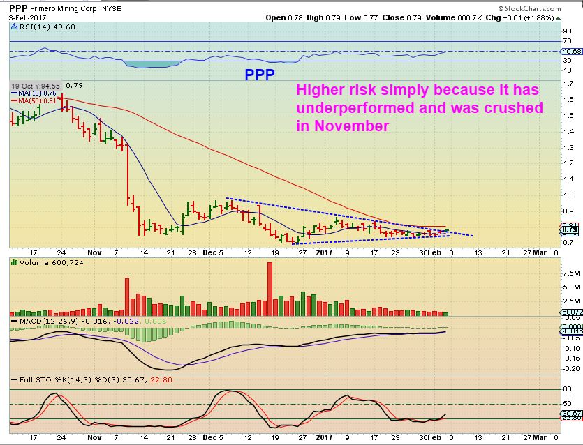 And try it in 2 juniors ( Like PPP and TRX for example). I’d do this just because the chance of increased % gains is in this set up. There are no guarantees, PPP could fail to follow through, but this is a strategy that I often use as a trader once a stock runs higher for a weeks.