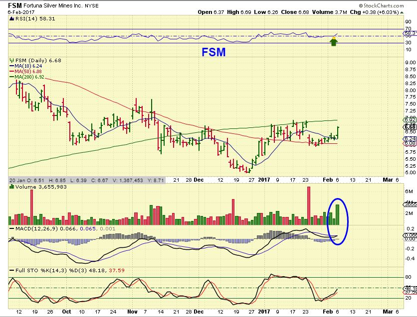 FSM DAILY – Just getting moving here? This is a low risk buy with a stop below the 50sma ( red line) and it looks ready to break above the 200sma ( green line).