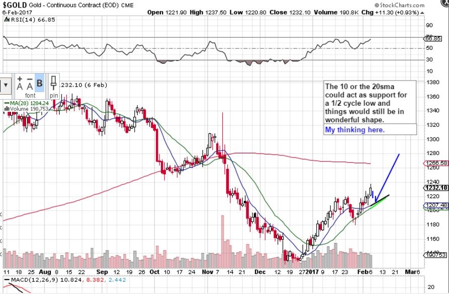 If gold gets a 1/2 cycle low during this DC, it could be on its way to finding it now. Just a guess here though. A touch of the 10 and definitely 20sma is a good buying opportunity for a week or 10 days higher…and the moving averages then become your hard stop.