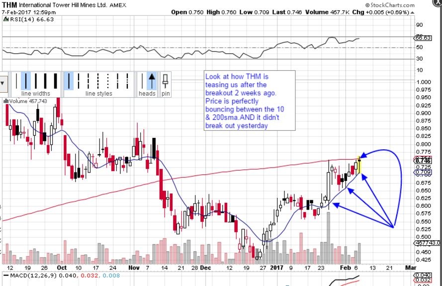 Those set ups in Miners quickly started piling up in Dec / Jan and that has been the focus, you have to make money in the sector that the Market says is a winner, you cant keep fighting the market if something goes wrong. Stops are a protection against our emotions at times. I dont go back and cover stocks that I got stopped out of, because they do not need attention or further management. . Stocks that are winners ( Lets say NAK) – I keep addressing that one because people needed another entry point, or where to take some profit , or where to raise a stop to. If it remains bullish, I keep reviewing it and its potential. Some trades drop, stop out, and never get good looking again.