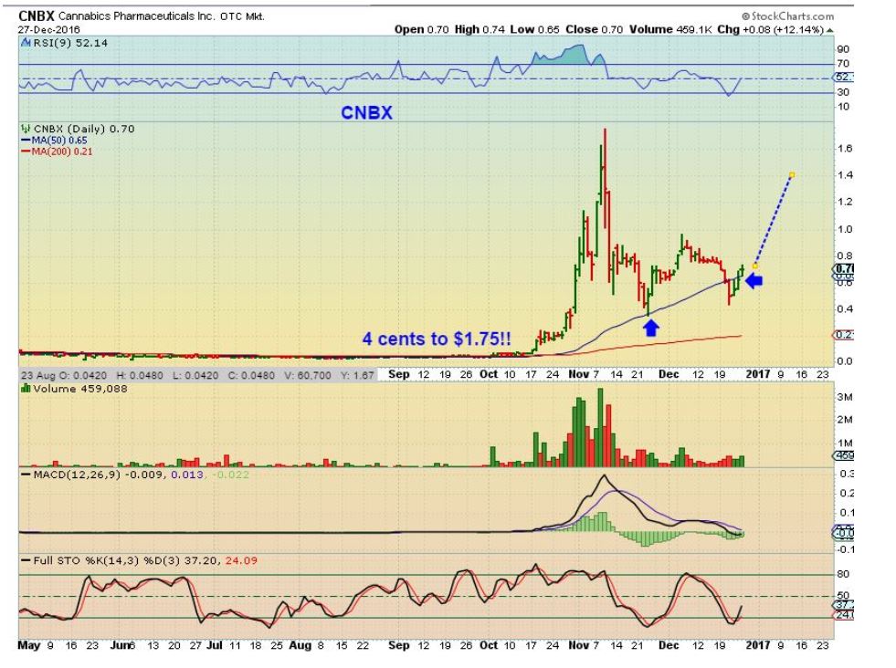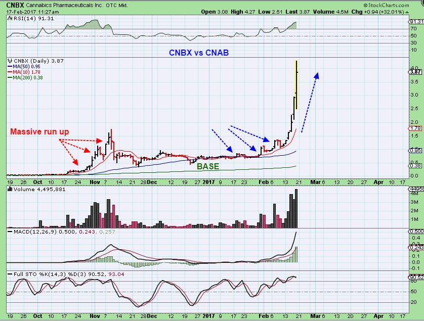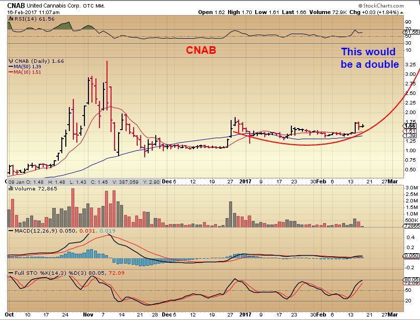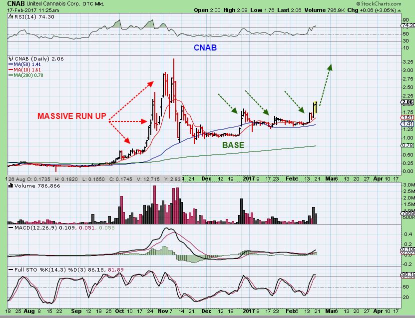 I recommend being reasonable in this sector , since business here may be somewhat unpredictable.  That having been said, since I wrote my Dec report, many of the stocks have actually doubled , tripled, or more, but many are also penny stocks. They are still higher risk, so please keep positions reasonable if you decide to take a trade.  I also said last week that I recently bought CNAB , because I thought that THE CHART SET UP  was similar to CNBX ( which has blasted off higher, like many before it).  I’m looking for charts with huge runs higher in November, and then a pullback and a base building process, so let’s take a look…