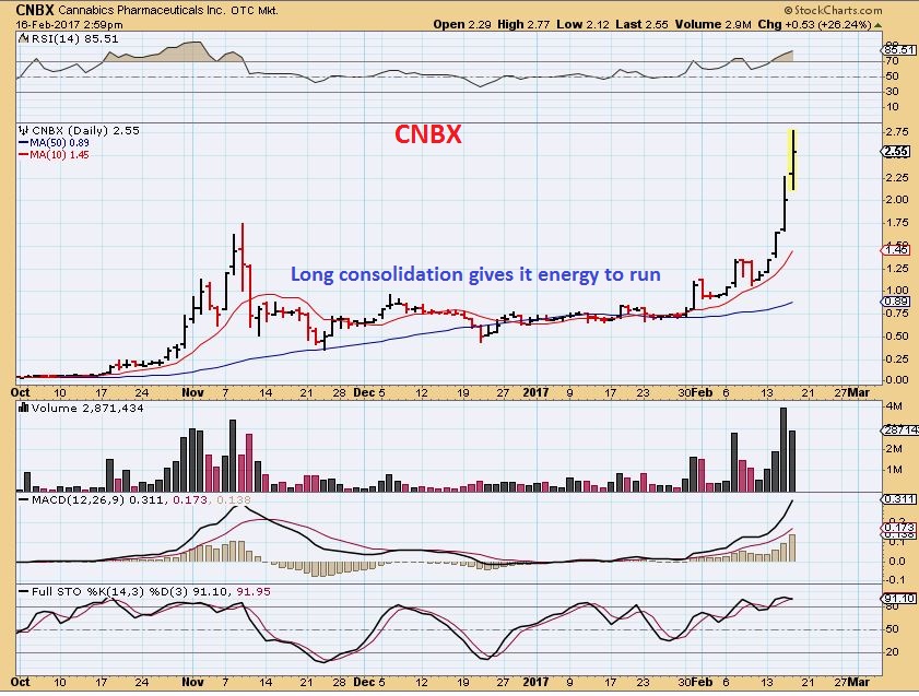 This is CNBX – After Popping a few times above the base (blue arrows), it just took off to new highs