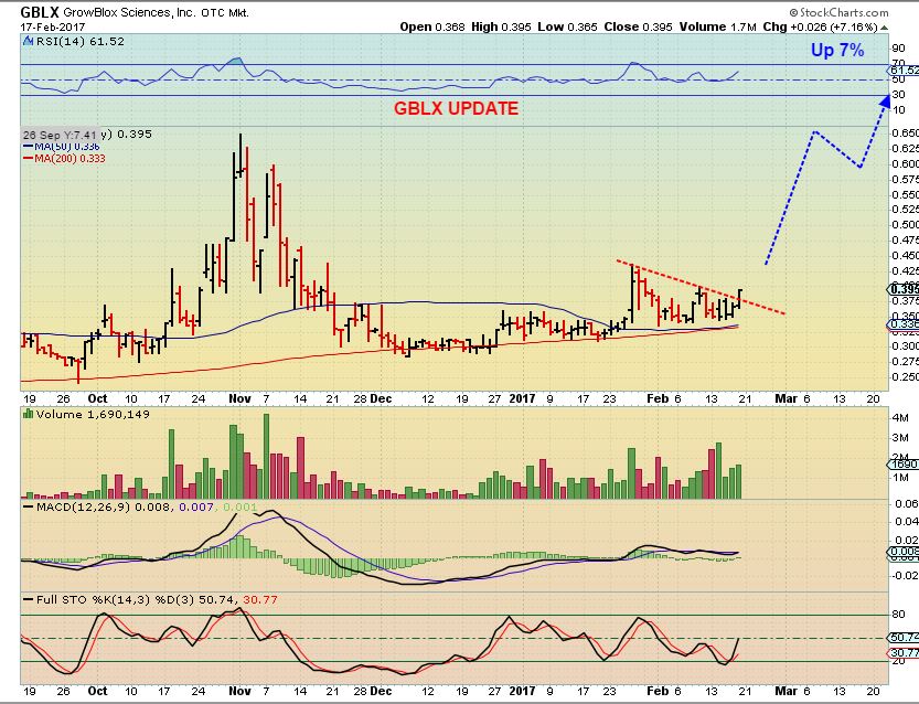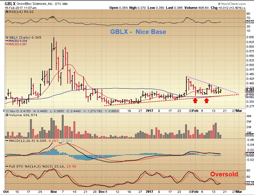 GBLX – As of Fridays close, we got the break out. These could still be considered a low risk entry, especially if it has a chance of running from $0.39 to former highs at $0.65 or more.