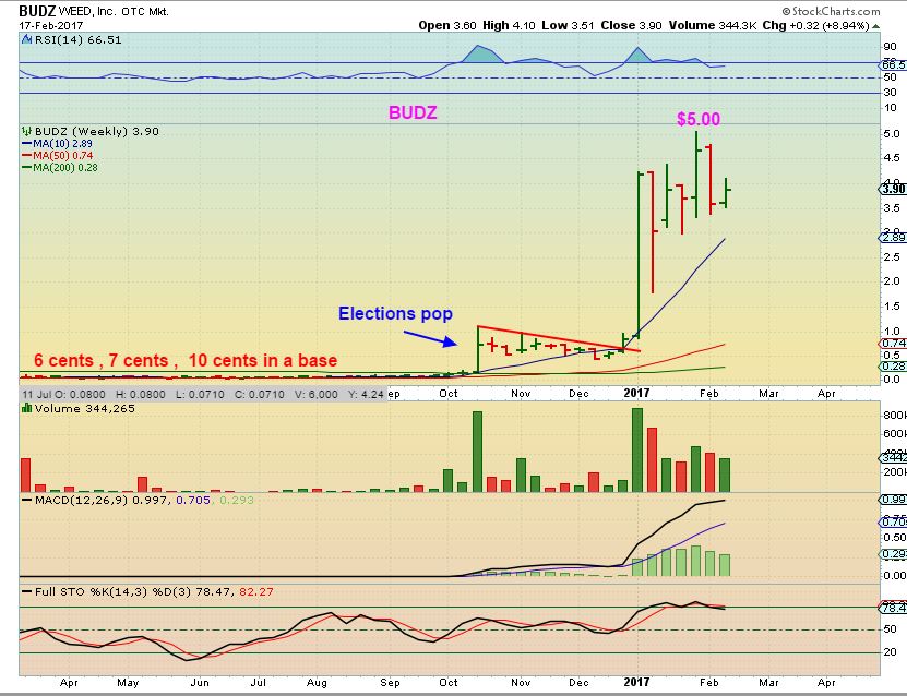 BUDZ –  This is one that I never covered before.  It has been V-E-R-Y strong after moving out of that first base and the second base, so I just wanted to point it out .  Can you say  7 cents to $5.00 in 4 months?