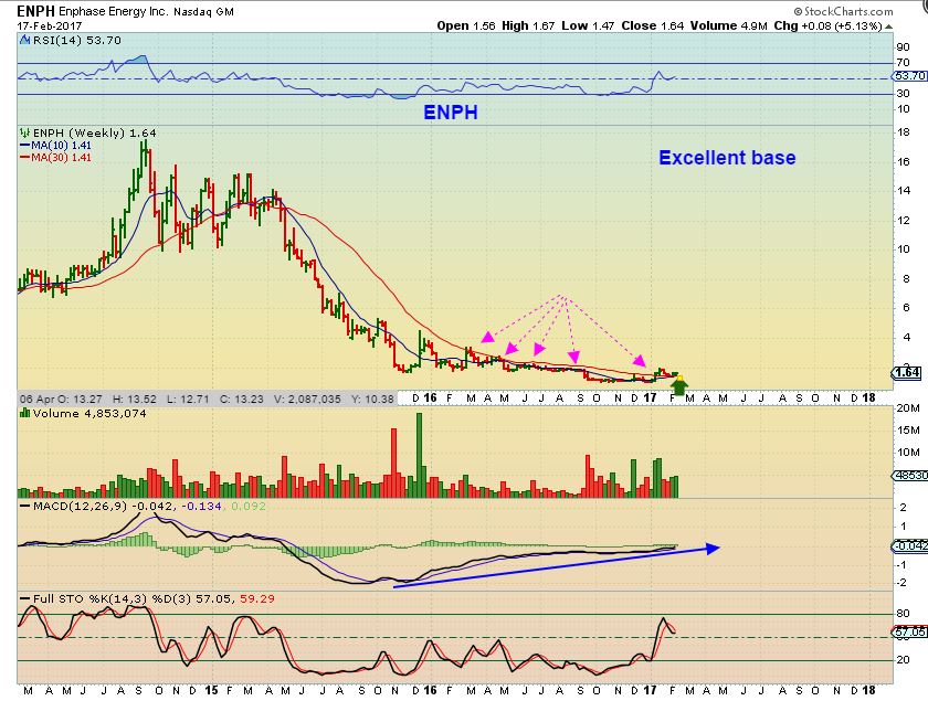 ENPH –  I did a little research on this one.  It isn’t in the business of manufacturing Solar Panels or installing them, but it a product that goes hand and hand with solar installation.  For lack of a better technical explanation, their product converters the electric current ( solar micro-inverter systems)  and business seems to be growing.  You may want to do your own due diligence.  I love the chart.
