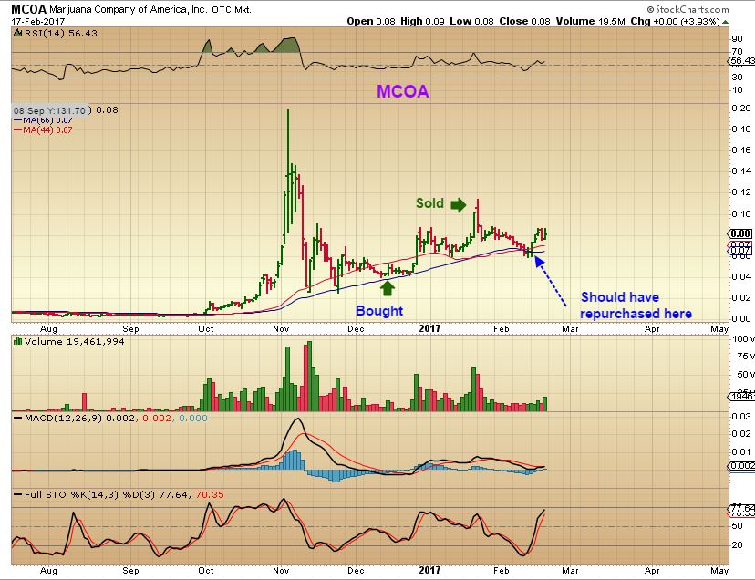 MCOA – This is one that I bought in December and when it ran up over 100%, I sold it ( roughly 4 cents to 10 cents).  It pulled back and is now almost right back to where I sold it.  I still like this set up, it is similar to what I pointed out in CNBX & CNAB in my humble opinion.