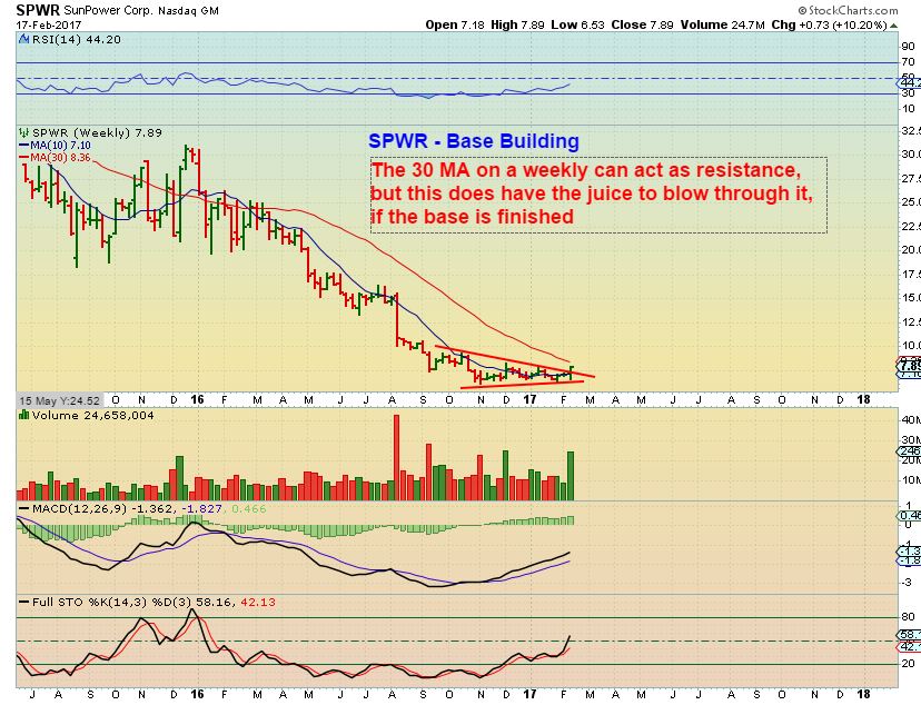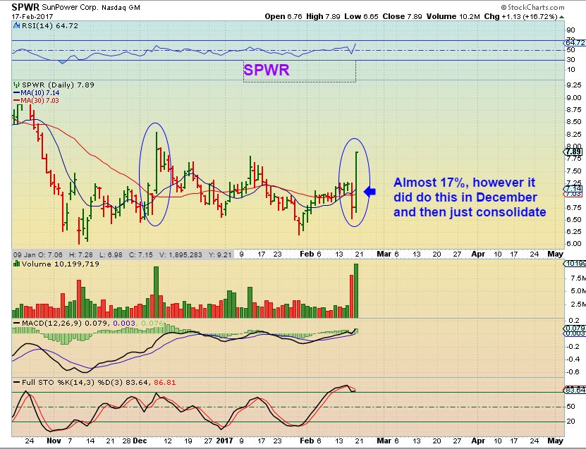 SPWR– It had a huge pop on Friday, but it has also done this in November as seem in the chart. After the Nov Pop, it continued to consolidate, so lets look at the weekly chart for clues.