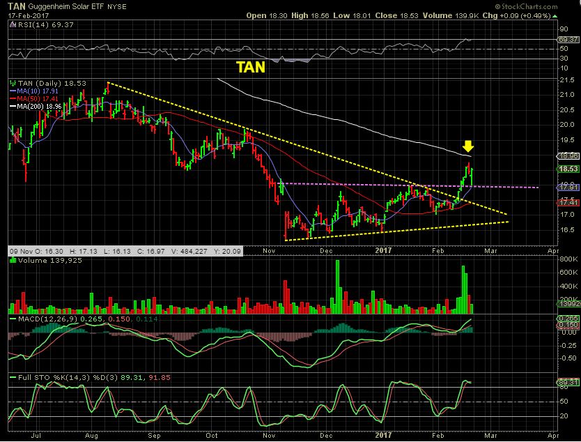 TAN DAILY – We see a break out and it dropped to the 10sma and reversed on Friday. It is at resistance and overbought, so we’ll see if it can break out or does it need to build up some steam first. It could stall for a bit first, and we’ll keep that in mind as we go through individual Solar picks below.