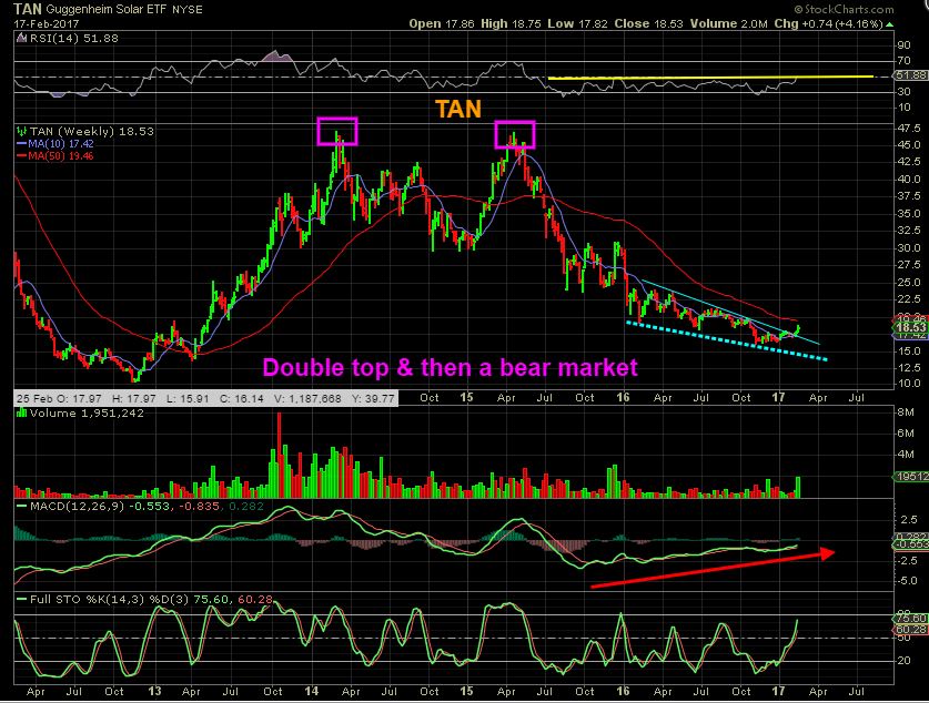 TAN WKLY – Let’s start with TAN, the Solar ETF.  It has broken out above a descending wedge and that’s a bullish start. It does have resistance above, so Solars MIGHT stall for a bit or they could just break through. We’ll be watching.