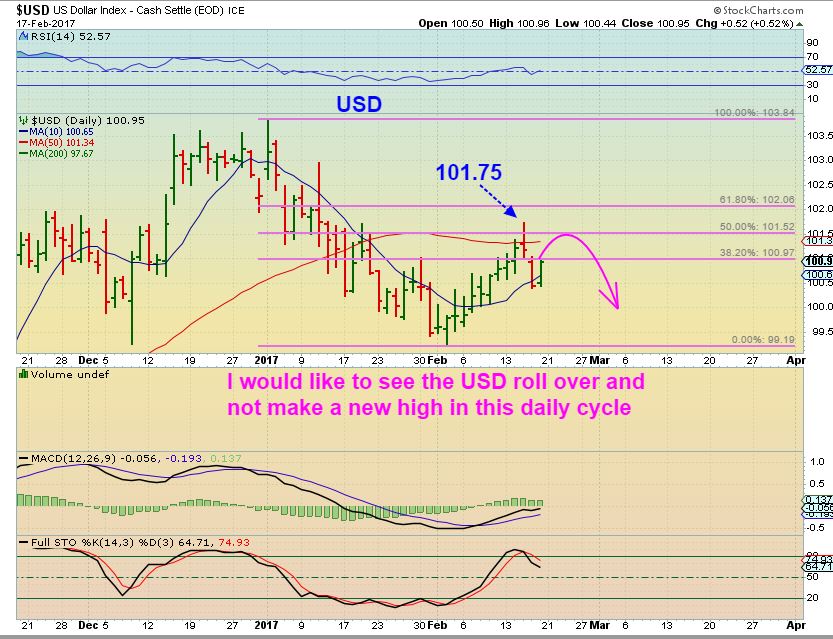 Note : THE USD is rising quite a bit this morning, it is good to see that GOLD is not dropping very much.  As I write, the USD is at 101.50, and I did mention this bounce as a possibility in the weekend report. I would like to see it roll over before hitting 101.75 to add to a weaker view of the Dollar.