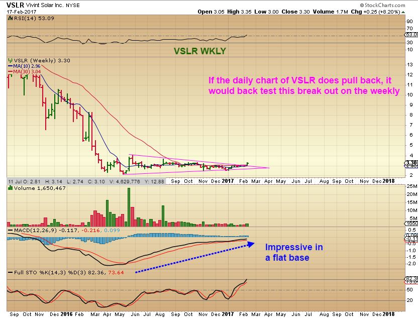 VSLR WEEKLY –  Awesome. You could buy & hold if you were patient and willing to just allow this one to do it’s thing.  It could just continue higher or continue to work its way out of that base.