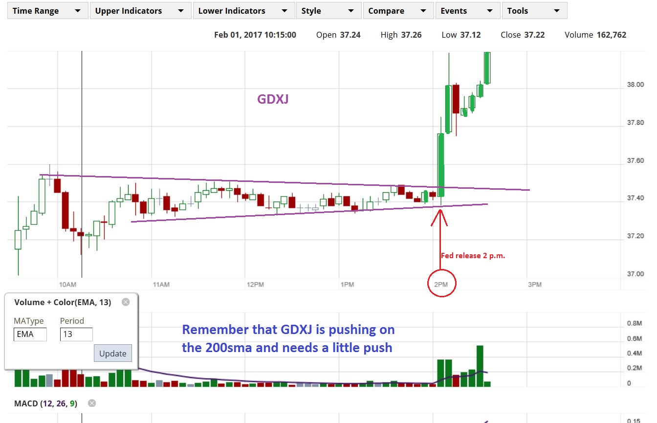 GDXJ – I was watching the Miners when the Fed Decision came out at 2 p.m. I had already determined in my mind what would be bullish and what would be bearish. This was my intra-day chart and I posted it in the comments section. I stated that we’d like to see GDXJ close Green and not give up all of the gains of this break out into the close.