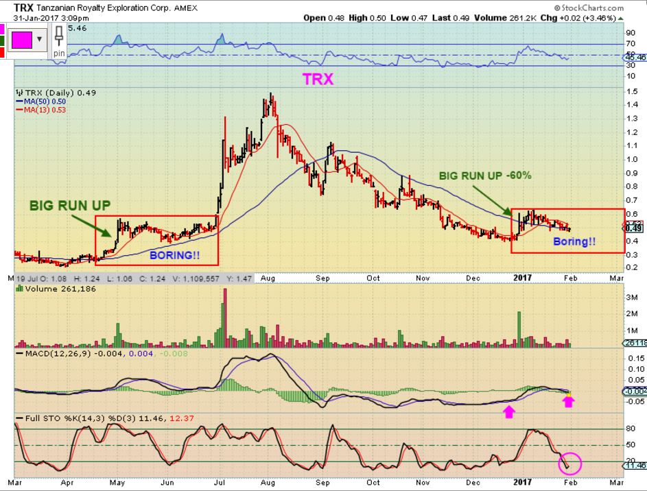 I know no one believes me, but I have had a gut feeling that TRX will be breaking out soon too. Look at the 2nd to the last chart in todays report. It is breaking through that magenta line right now. Next week, I think it is higher 🙂 Bort!
