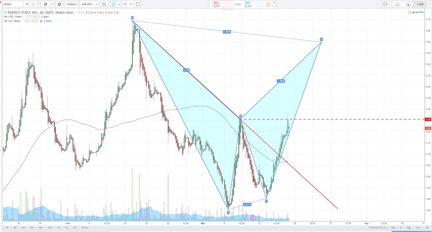Heres what I see. Trend line break but possible Double top for sure, BUT a higher high on the hourly chart, and a big ole, almost perfect, BEARISH BAT pattern playing out. So If we do get past the double top, we should make a run higher to the $2.60 are. Just my 2 cents! https://uploads.disquscdn.com/images/4d3f7c9420f4b731958a83b4ba3b82136f79c61f2771691ca3dce3df66722bb7.jpg