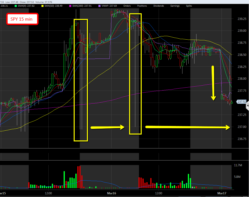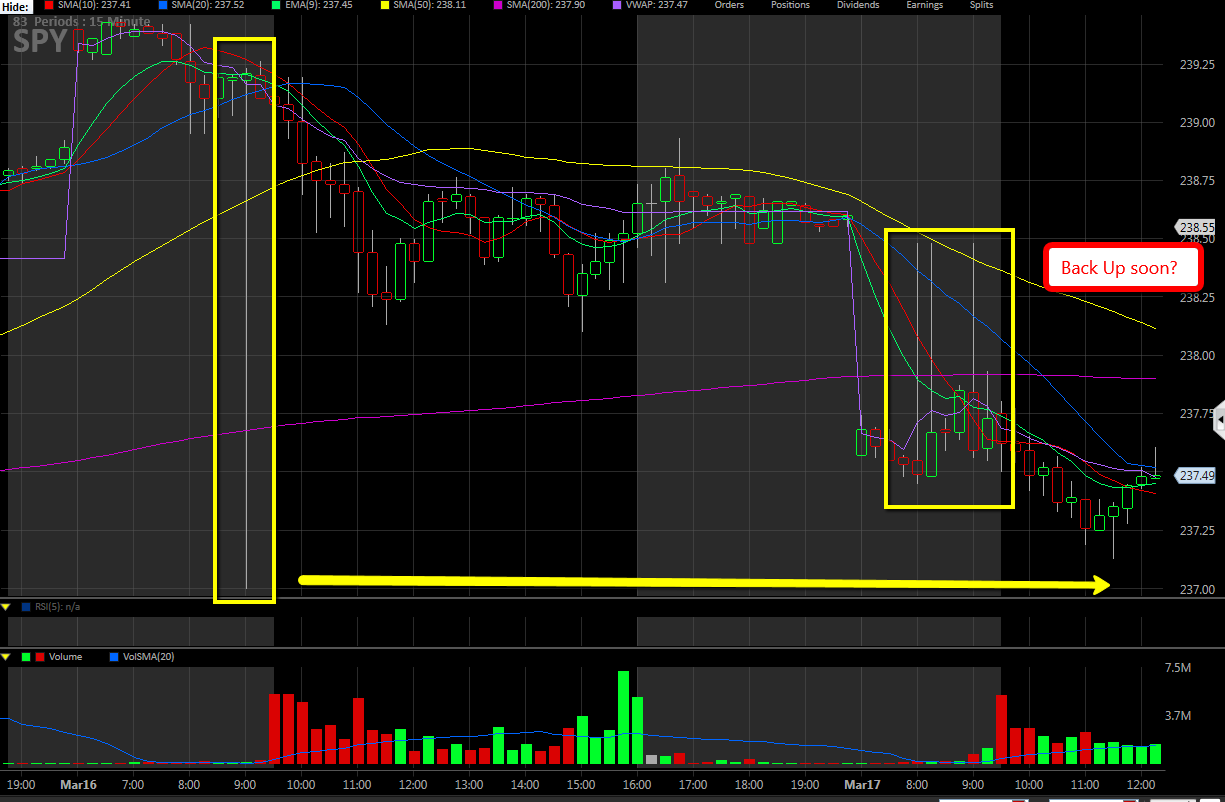 To continue with the trading conspiracy theory stuff, I want to show that the “signal trades” I have been posting appear in other sectors. I see those long tail candles most often in SPY which is the most popular way to trade the S&P. Check out these signal trades from Wednesday’s AH and yesterday’s pre-market for SPY. They have a bearish price target around the $237.00 area. As you can see that they are on their way to their goal in the early pre-market trading today. BUT if you look closely, you will also see a “signal trade” candle with a long tail UP to about $238.50 … so bulls and bears are battling each other.