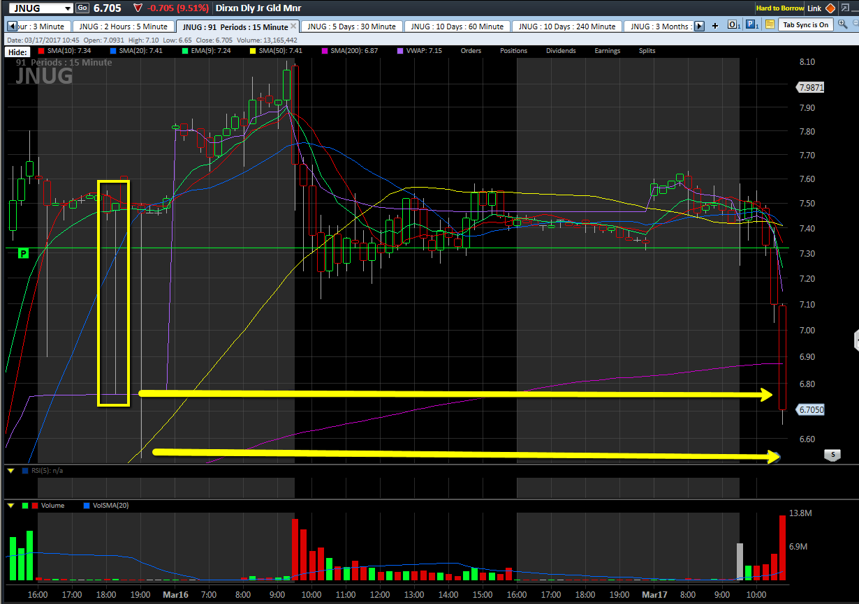 JNuG reversal is pretty. Big flush, bounce to 13ma (5min), retrace 25%, now heading to vwap… what’s next?