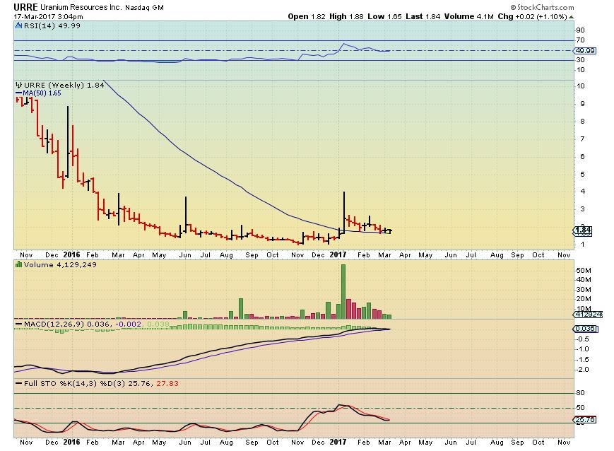 I’m going to post 3 Uranium stocks and I want you to notice just how similar these set ups are. If 1 of them breaks out, will the others follow? It is possible, so we’ll start with the one that broke out above the 50sma yesterday.