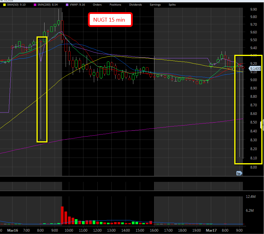 Some scary “signal trade” candles in NUGT yesterday and today. Miners look like they will open as a “sell” on my 15 min charts, but that signal could quickly reverse to a “buy” with a slight pop after the open.