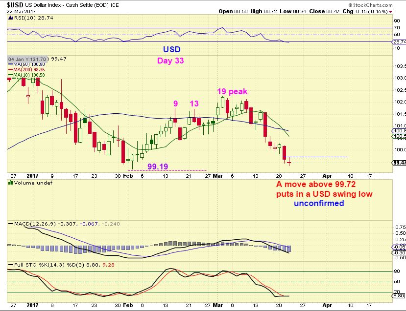 EDIT: The USD went to 100 last night, and is dropping now. That puts an unconfirmed swing in place as long as the low of 99.34 isn’t taken out. I’m also watching Februarys 99.19 .