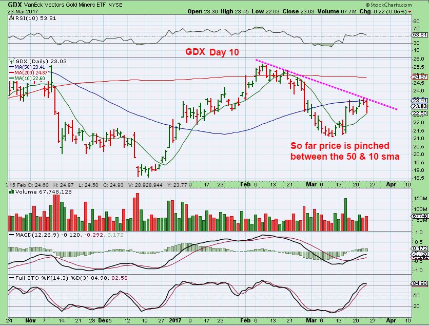 GDX – Almost 1 month ago I said that I would probably short the Miners at the 50sma back test. After explaining all week what I am seeing, and that was that Gold is rising 6 days in a row and Miners are struggling at the 50sma, I did buy JDST at the open on day 10. I sold 1/2 for a good gain of almost $1 per share, and may hold the rest to see how this plays out.