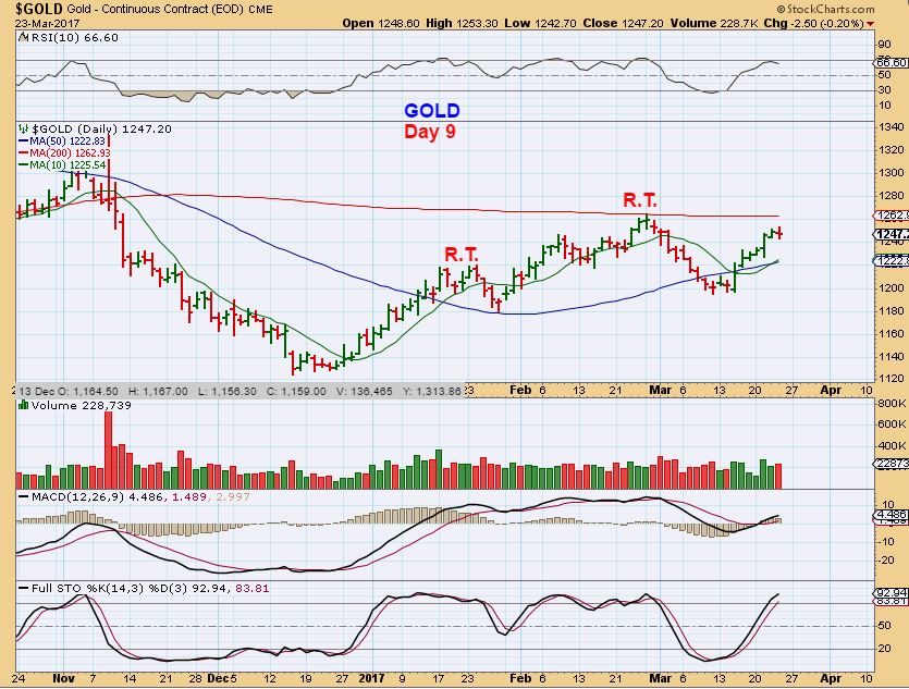 GOLD – DAY 9 and Gold stalled. By now you know my expectations. I think that Gold will top in this 3rd daily cycle soon, and then drop into a dcl and an ICL eventually too. Yes, at a glance this chart looks bullish, but Miners have been stalled out for about a week, while Gold was up for 6 days in a row.