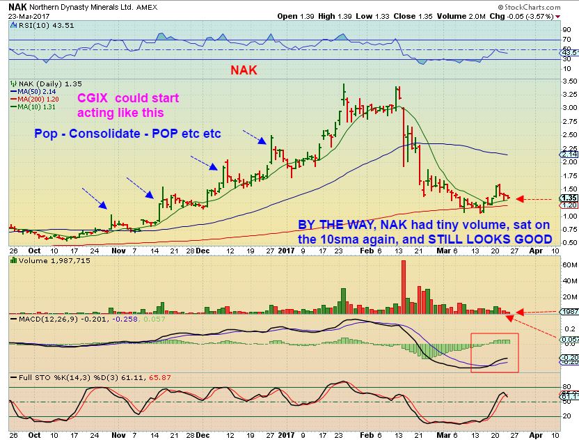 1. CGIX could climb in the same manner that we saw NAK climb on the left of this chart. I added on the dips all the way up, and it doubled and tripled in the following months. NOT AS EASY AS IT LOOKS, but rewarding for the patient ones.