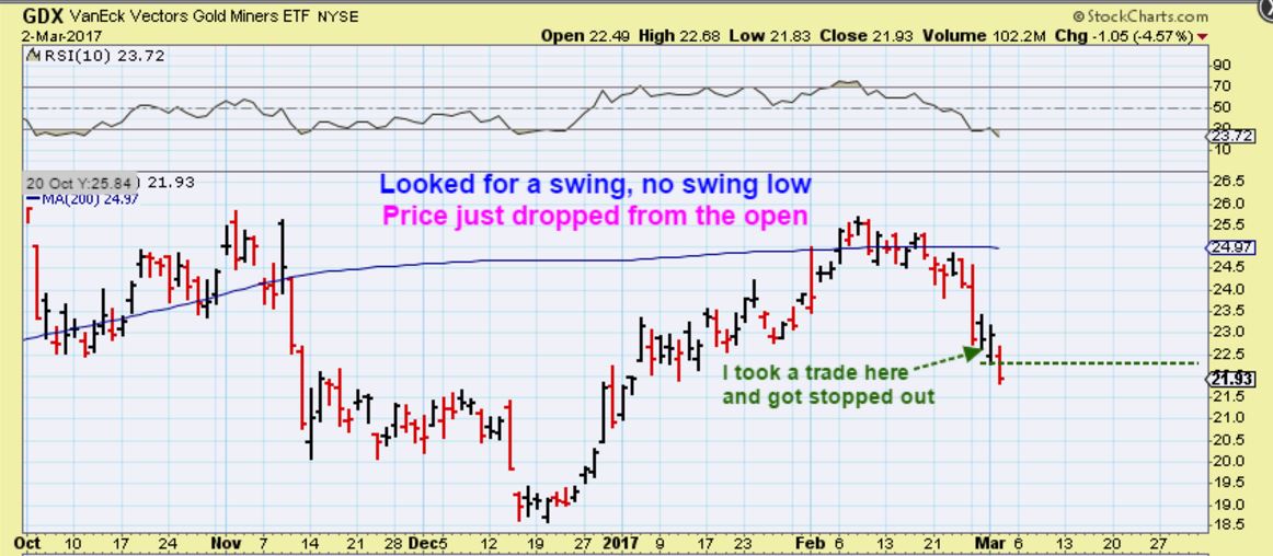 And this was GDX on Thursday. It did not even attempt to run higher and put in a swing, so if you are a ‘conservative trader’ that was waiting for the swing low- you have no further damage. That is the safer method, and this is proof as to why that is.