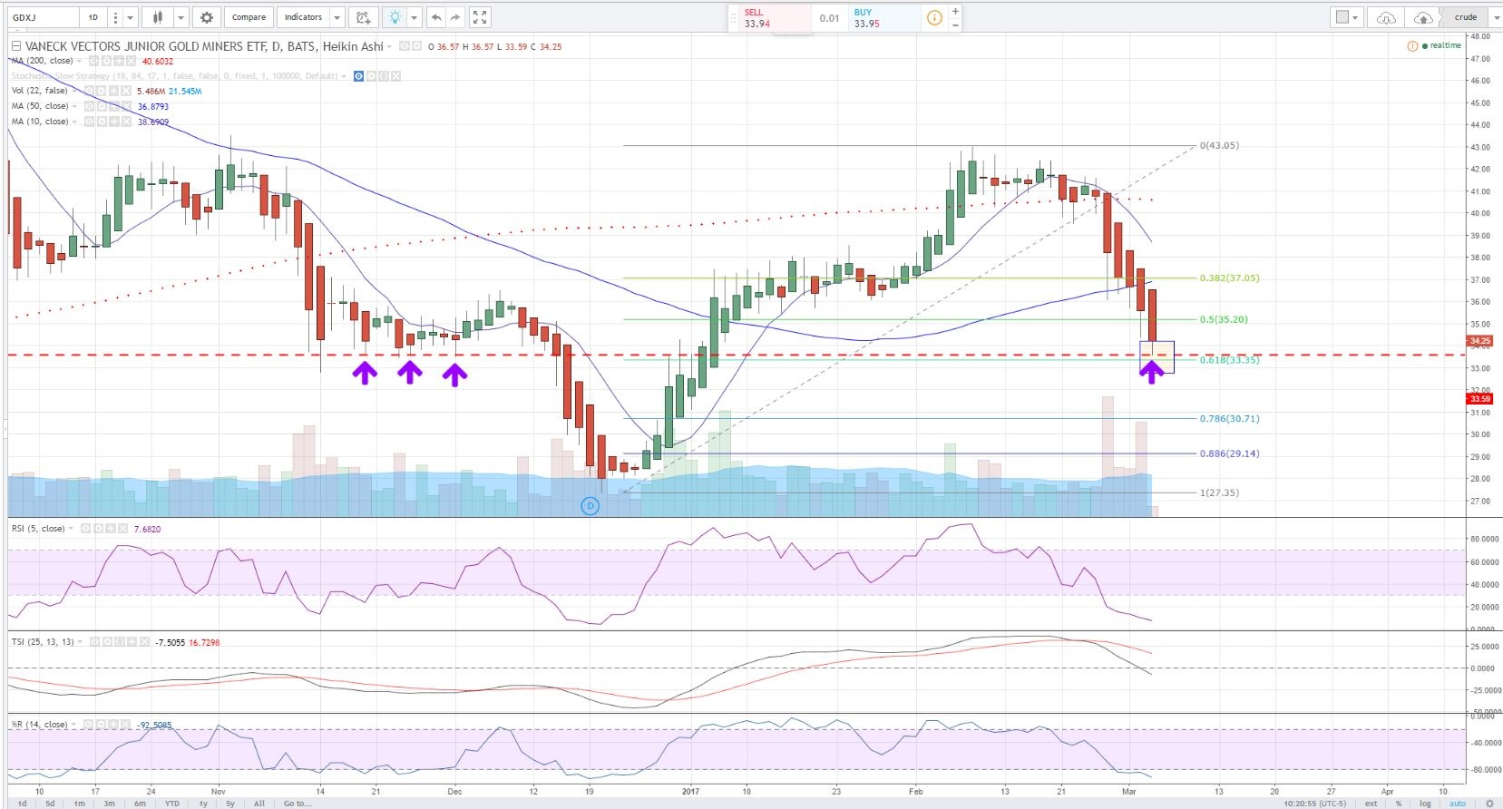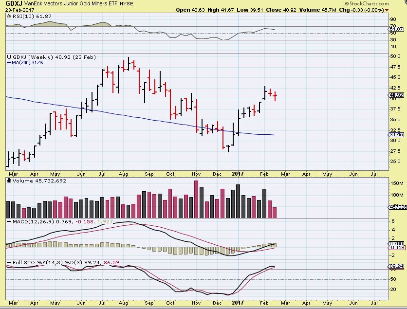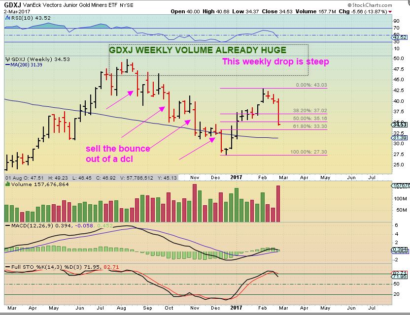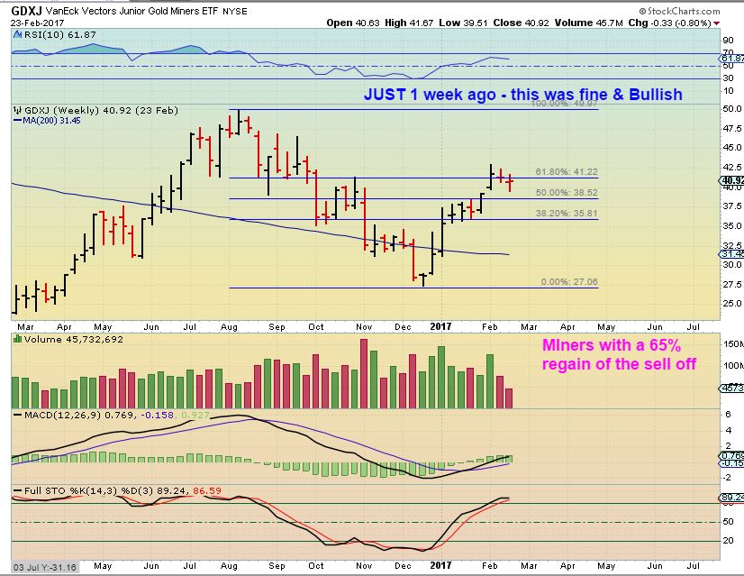 I wanted to add a chart of GDXJ just last week. Last week everything seemed just fine. This was a solid run higher from Dec through February. The recovery was a rally of over 62% of that 6 month drop in just 2 months. That seemed strong.