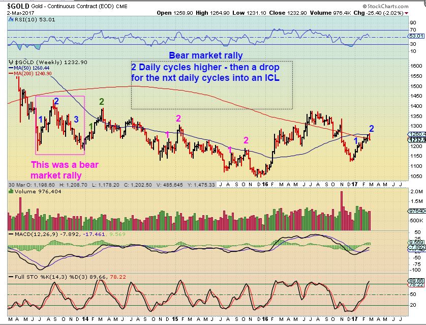GOLD -I drew this chart when Gold was bottoming in the summer of 2015. It shows how cycles look in bear markets. NOTICE WHAT I WROTE: You get a convincing 2 month rally even in Bear markets ( 2 daily cycles) and then it rolls over for the next 2 or 3 daily cycles. This is an old chart, you don’t need to read it, just that we get 2 month rally ( 2 daily cycles higher) in a bear market rally.