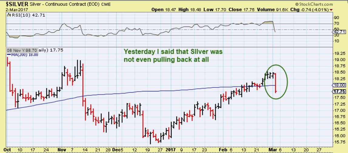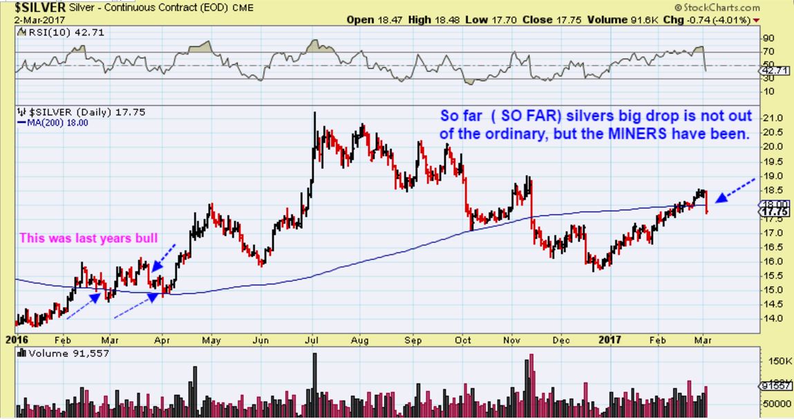We have seen sharp sell off days like that in Silver in last years Bull run too, so I CANNOT say that it alone is definitely a bearish longer term indicator. We lost the 200sma, and that is bearish too, but we also did that in Feb 2016. We need more evidence.