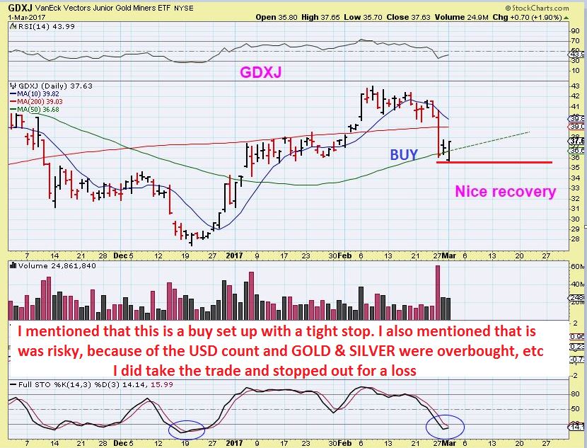 A reversal that eats up more than 1/2 of the prior days candle can be bought with a very tight stop. I mentioned that Conservative traders would WAIT for a swing low to be in place. The conservative trader was safe. I took the trade at the 50sma on Wednesday and got stopped out of JNUG for a semi bigger loss. Maybe my position was too big.