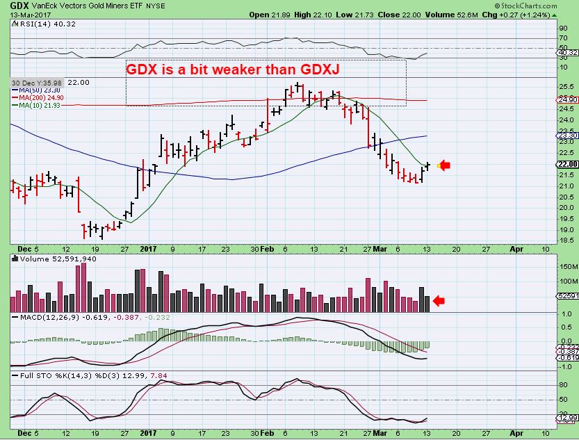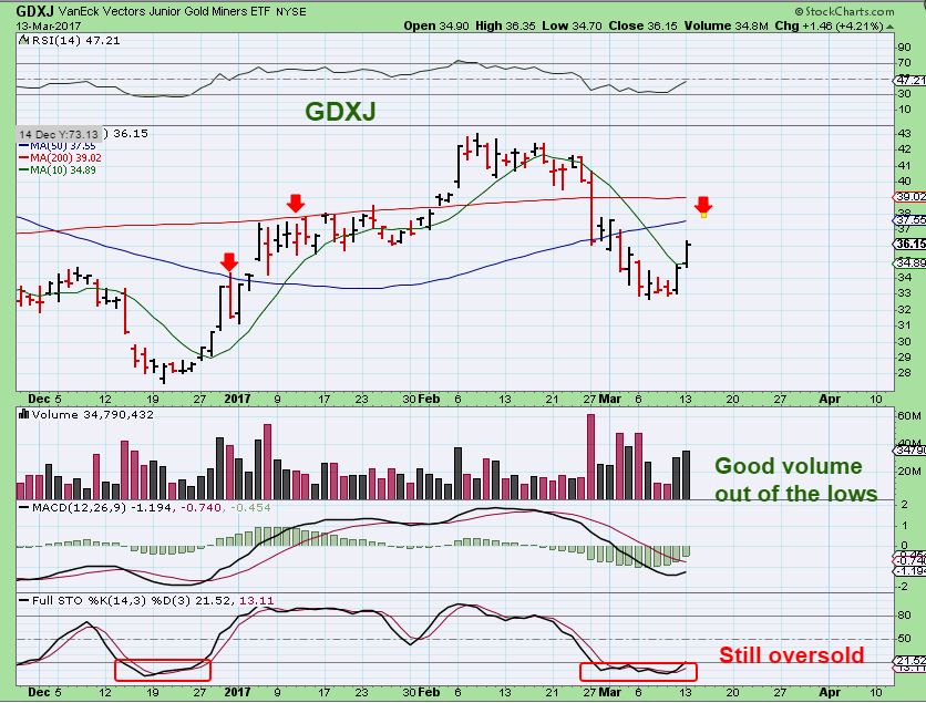 GDXJ – I wanted to start with GDXJ, because it looks stronger than GDX. I like the volume on the follow through Monday and it is still oversold, but there is resistance above with the 50 & 200sma. GDXJ could hit there on Fed Wednesday or even Tuesday. I placed red arrows on the January area to show that GDXJ paused at both of these MAs earlier.