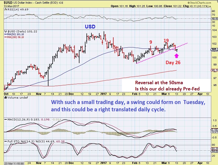 USD – This actually could be the start of a dcl. The timing is right and we had a reversal at the 50sma. This complicates things even more 🙂 Gold looks set to put in a dcl, and the USD looks set to put in a dcl, all at the same time, a day before the Fed Decision?