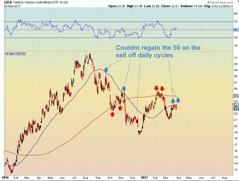 GDX from March 24– The 50sma has been back tested and it has acted as a barrier in prior weak daily cycles.