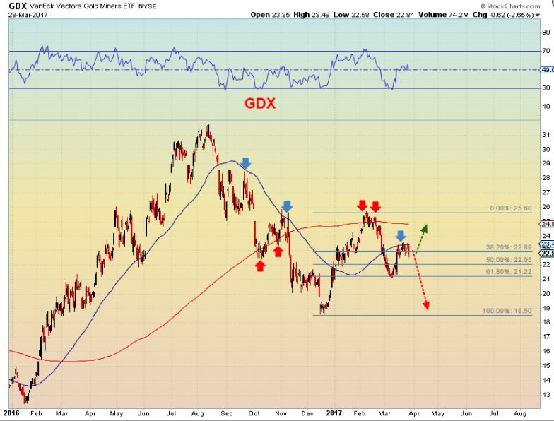GDX – We have to be somewhat aware that markets can do anything that they want, and that this can go either way, but the probabilities are starting to lean strongly towards the downside pathway.